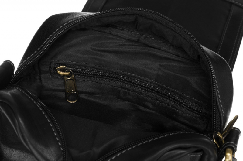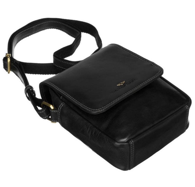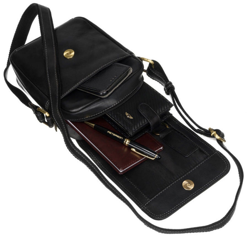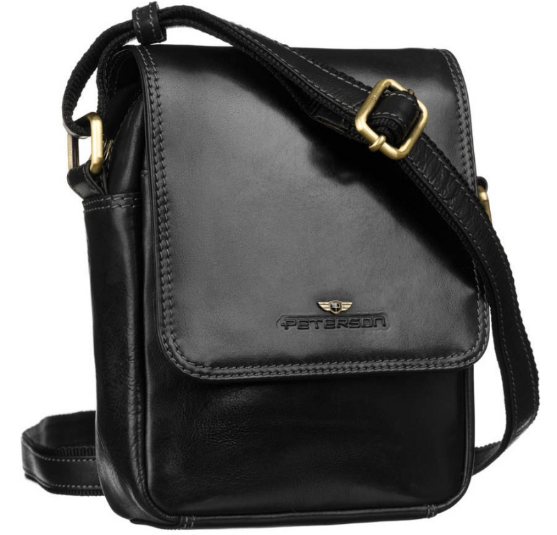Čierna pánska kožená taška cez rameno Peterson je vyrobená z kvalitnej prírodnej kože. Pánska značková crossbody je rozdelená na hlavné veľké vrecko, ktoré sa uzatvára pomocou zipsu a otvorené predné vrecko. Celá taška sa potom uzatvára pomocou klopy na magnetický patent. Zadná strana pánskej koženej tašky taktiež obsahuje uzatvárateľné vrecko na zips.