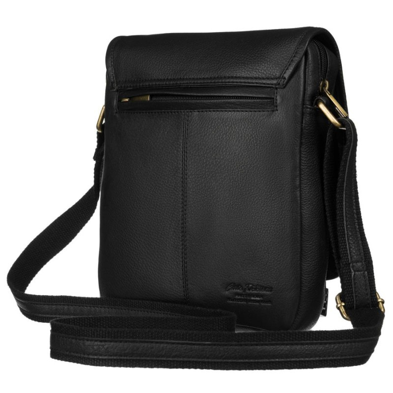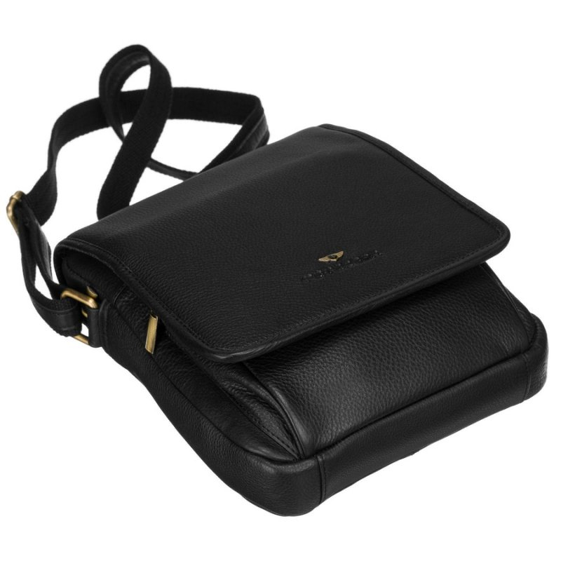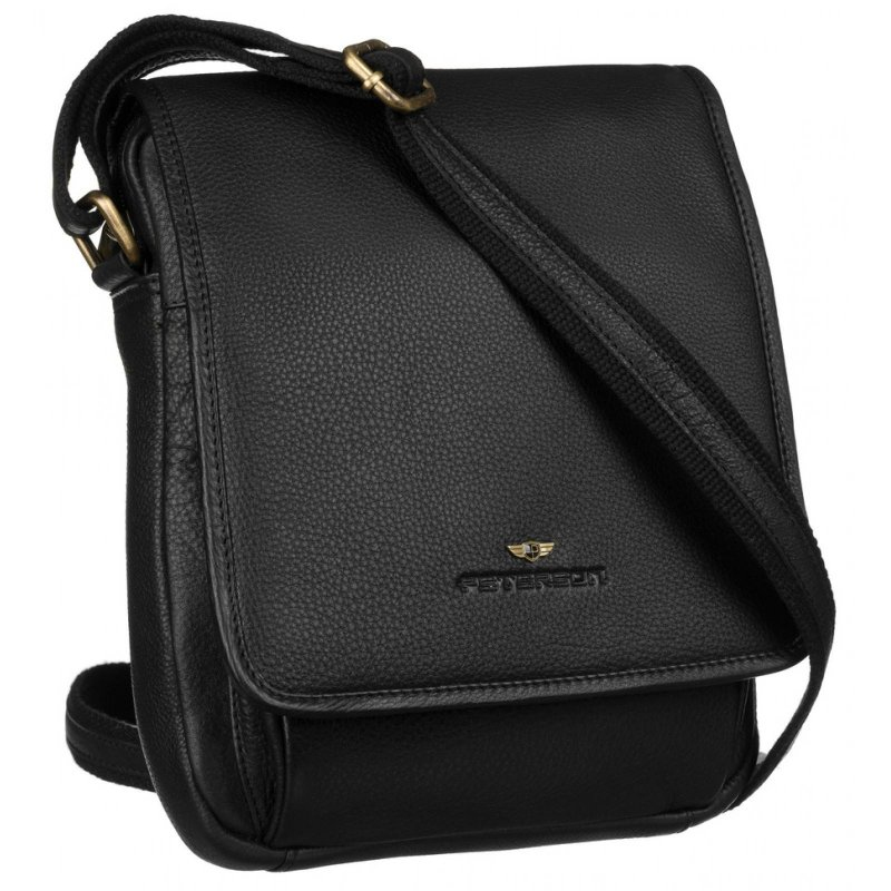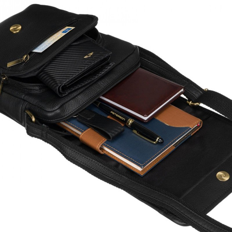 Čierna pánska kožená taška cez rameno Peterson je vyrobená z kvalitnej prírodnej kože. Pánska značková crossbody je rozdelená na hlavné veľké vrecko, ktoré sa uzatvára pomocou zipsu a ďalšie dve predné vrecká schované pod chlopňami na magnetický patent. Zadná strana pánskej koženej tašky taktiež obsahuje uzatvárateľné vrecko na zips.