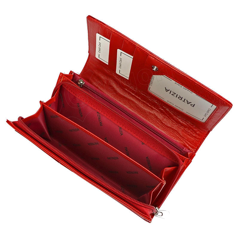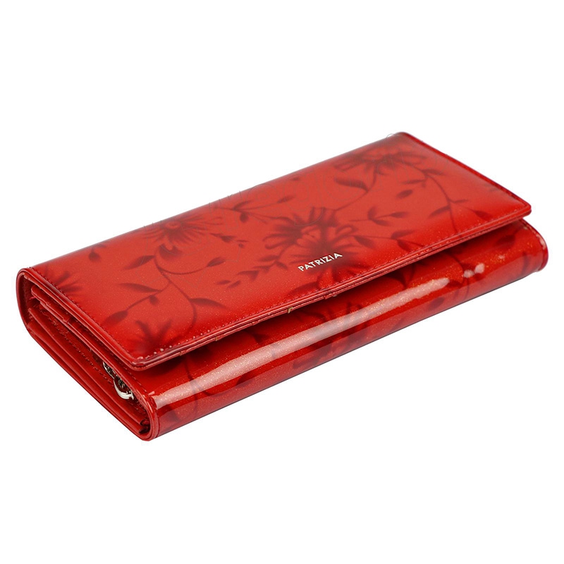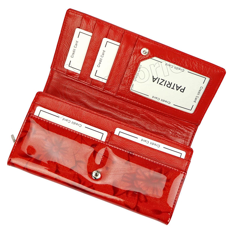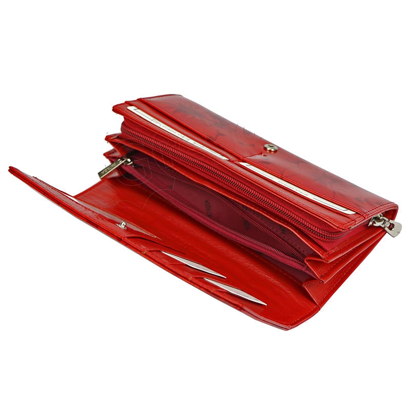 Kožená dámska peňaženka je vďaka ornamentom kvetu a veľmi jemnému trblietavému vzhľadu krásna, nevšedná a nebude jej mať určite každý. Má 2 priehradky na bankovky a 2 na kovové mince a jednu na drobnosti, všetko zapínateľné na zips. Ďalej je vnútri dámske peňaženky 9 priehradiek vhodných napríklad na kreditnú kartu a väčšia kapsička napríklad na technický preukaz, alebo účtenky.