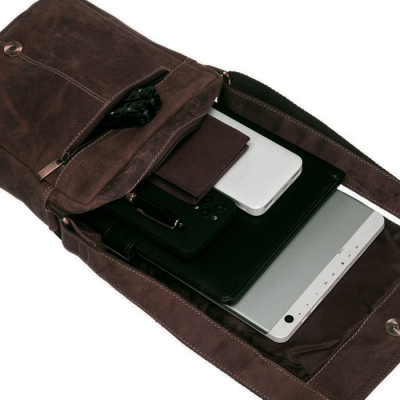 Na prednej strane pánskej koženej tašky je vodorovné vrecko pre rýchly prístup napríklad ku kľúčom a ďalšie vrecko sa nachádza na zadnej strane tašky. Predná klopa je potom vybavená magnetickým patentným uzáverom. Extra dlhý popruh umožňuje pohodlné nosenie diagonálne cez hrudník.