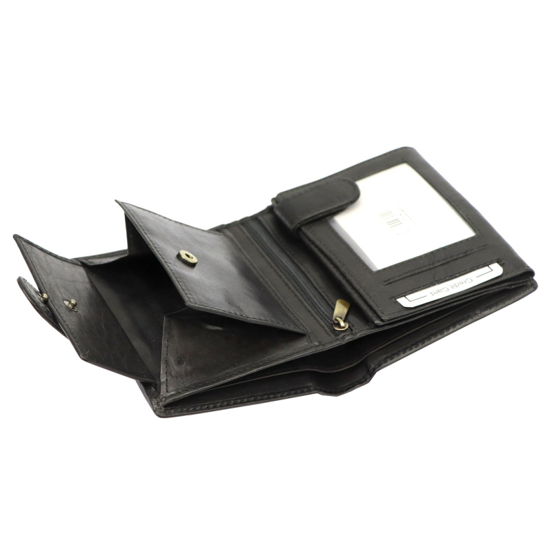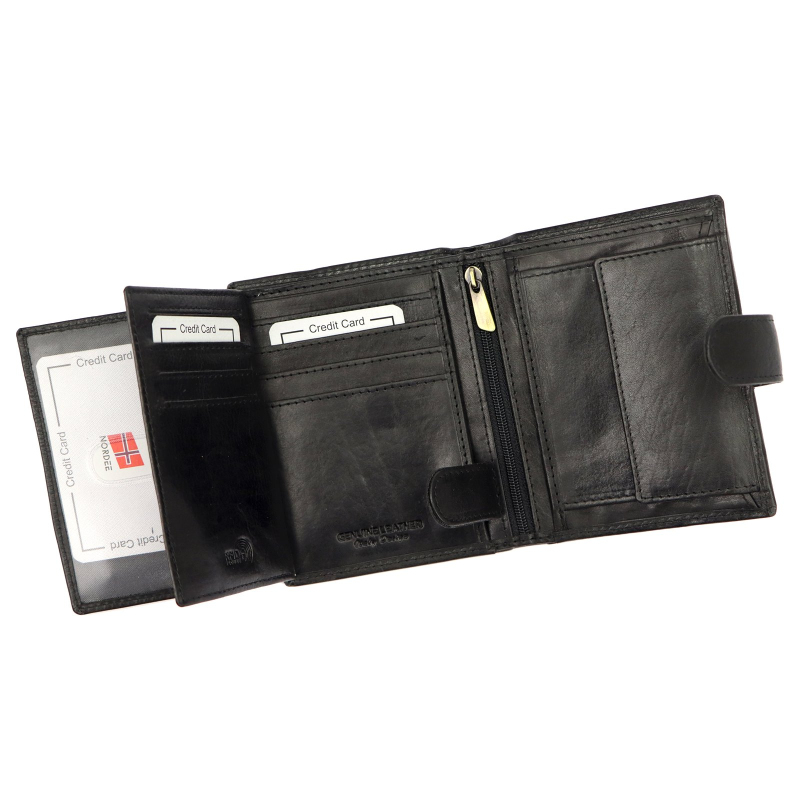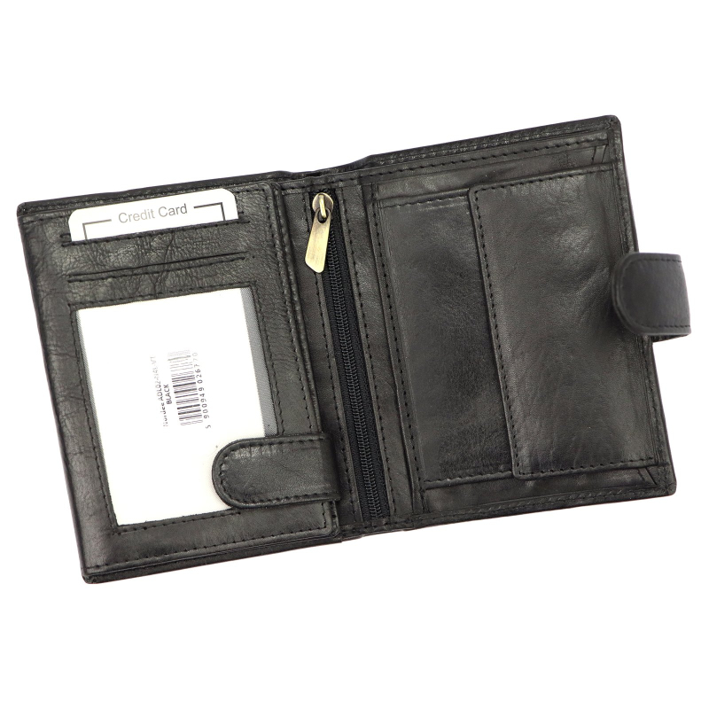 Kvalitná pánska peňaženka z prírodnej kože čiernej farby, má 2 priehradky na bankovky a jednu na kovové mince. Ďalej je vo vnútri pánskej peňaženky 8 priehradiek vhodných na karty a 4 väčšie vrecká na technický preukaz, alebo iné doklady. Aby bolo možné zladiť celkový vzhľad, je možné k peňaženke tiež zakúpiť čierny opasok a pánsku tašku.