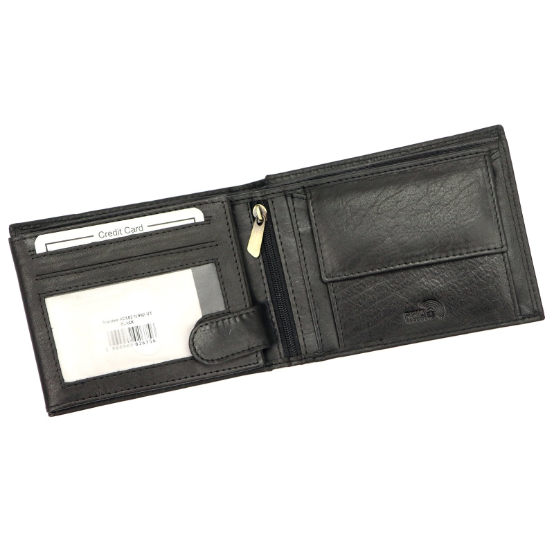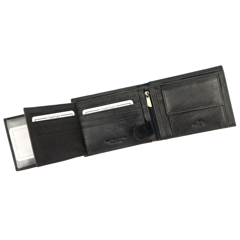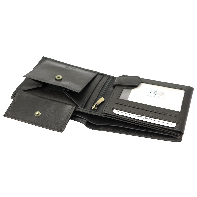 Kvalitná pánska peňaženka na šírku čiernej farby, má 2 priehradky na bankovky a jednu na kovové mince. Ďalej je vo vnútri pánskej peňaženky 8 priehradiek vhodných na karty a 5 väčších vreciek na technický preukaz, alebo iné doklady. Aby bolo možné zladiť celkový vzhľad, je možné k peňaženke tiež zakúpiť hnedý opasok a pánsku tašku.