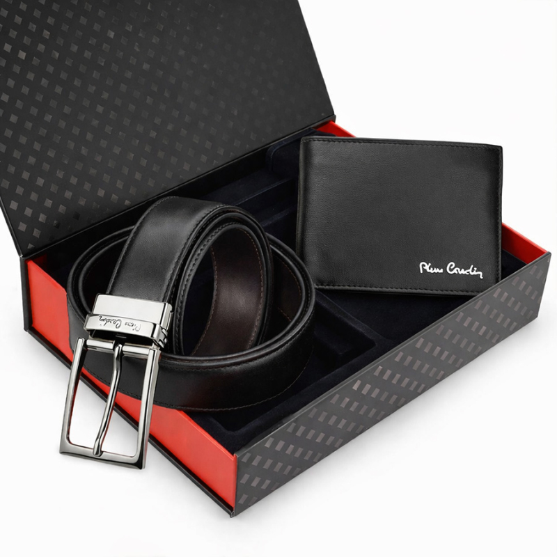 Pánska darčeková sada Pierre Cardin obsahuje luxusnú pánsku peňaženku a obojstranný čierno hnedý opasok Pierre Cardin, vyrobené z kvalitnej prírodnej kože.