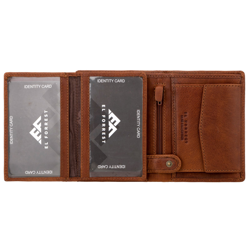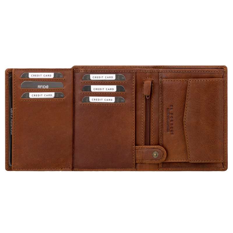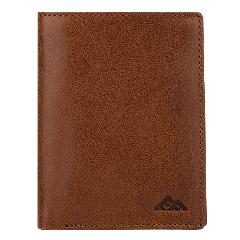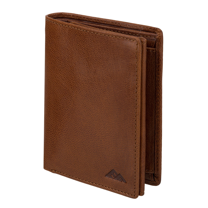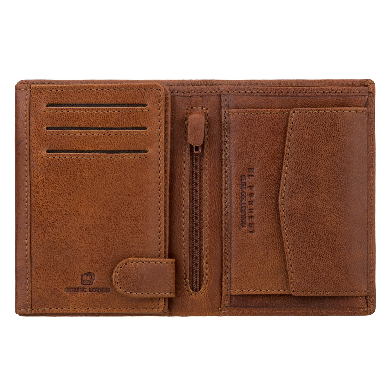 Luxusná pánska peňaženka z prírodnej kože vo farbe hnedá koňak, má 2 priehradky na bankovky a jednu na kovové mince. Ďalej je vo vnútri pánskej peňaženky 9 priehradiek vhodných na karty a tri väčšie vrecká na technický preukaz od vozidla, alebo iný doklad.
