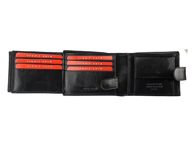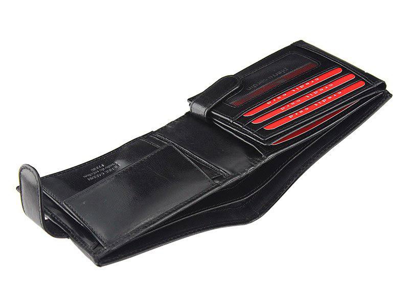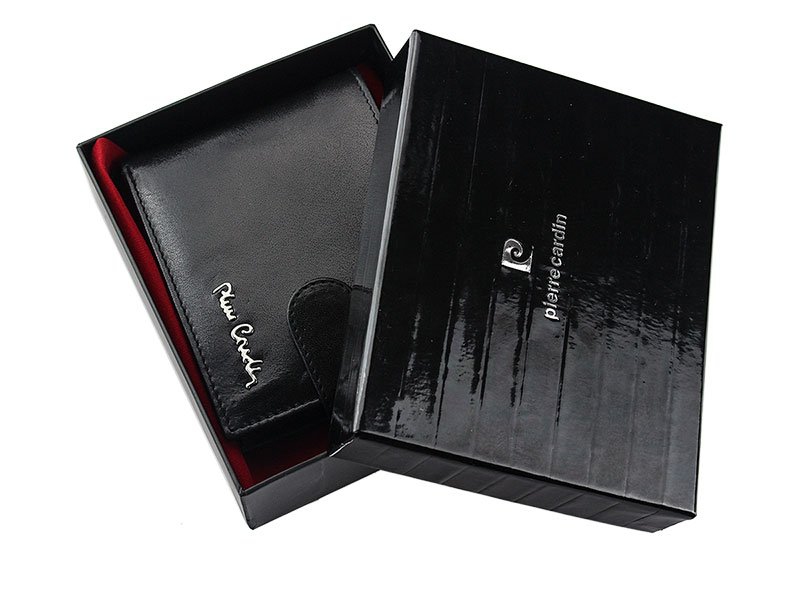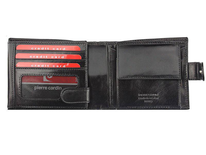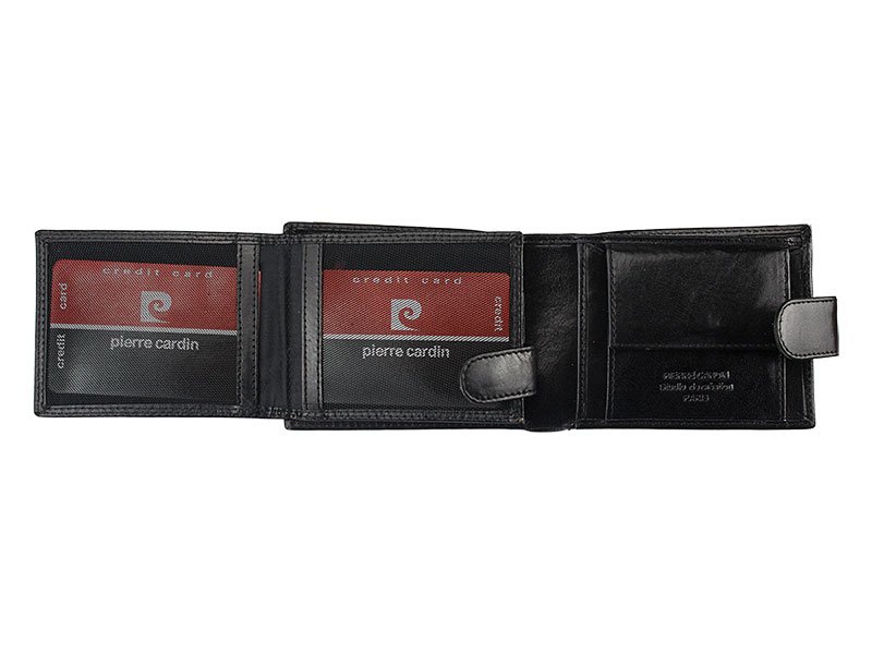 Značková pánska peňaženka Pierre Cardin má 2 priehradky na bankovky a jednu na kovové mince. Ďalej je vnútri pánske peňaženky 9 priehradiek vhodných na karty a tri väčšie na občiansky alebo vodičský preukaz.