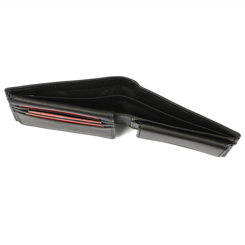 Peňaženka Má 2 priehradky na bankovky a jedno vrecúško na kovové mince. Ďalej je vo vnútri pánske peňaženky 8 priehradiek vhodných na karty a tri väčšie na občiansky, vodičský, alebo iný doklad.