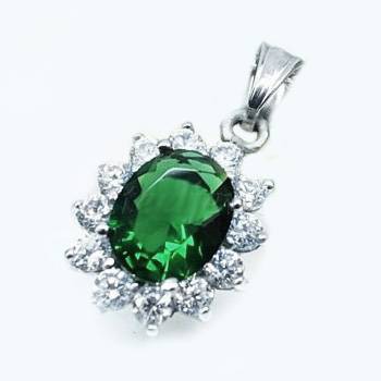 Dámsky prívesok tvorí kamienok smaragdovej farby lemovaný trblietavými, bielymi zirkonky. Šperk je vhodné doplniť jemným retiazkou, ktorý nájdete aj v našom klenotníctve.