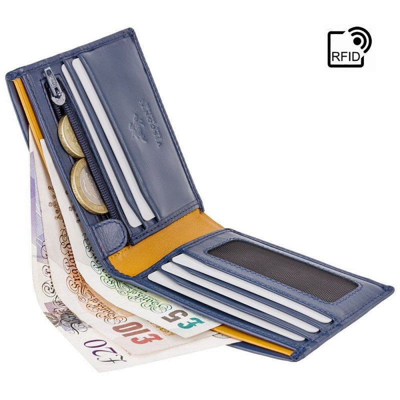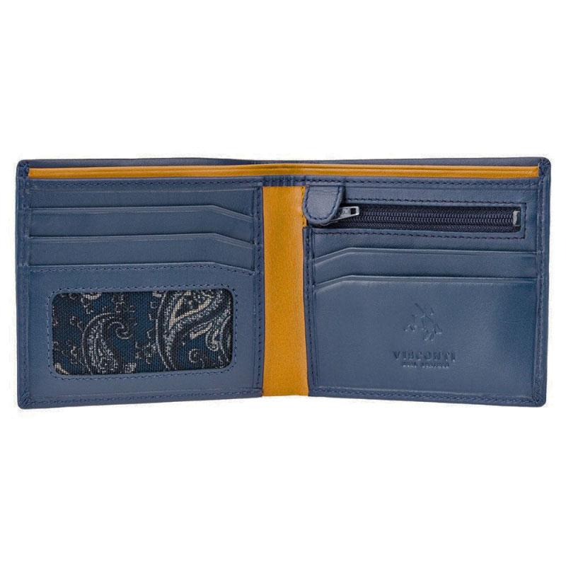 Tenká modrá pánska kožená peňaženka Visconti sa vyznačuje na dotyk príjemnou prémiovou prírodnou kožou, kvalitným ručným prešitím a značkovou podšívkou so znakmi Visconti. U pánskej peňaženky bola podšívka a každý slot na kartu farebne kombinovaný tak, aby poskytovali čo najkrajší vizuálny zážitok.