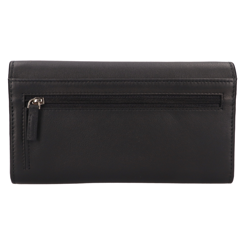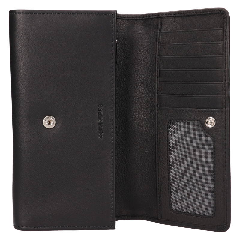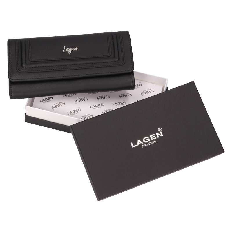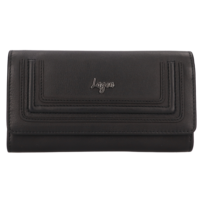 Značková dámska kožená peňaženka Lágen je vyrobená z kvalitnej prírodnej kože, prednú časť čiernej dámskej peňaženky zdobí strieborné kovové logo.