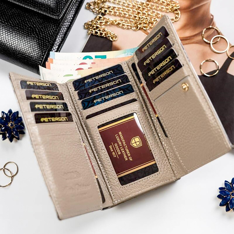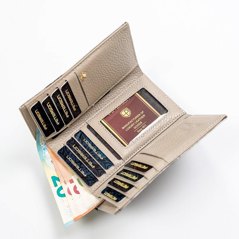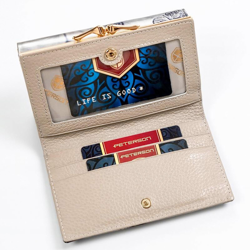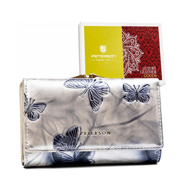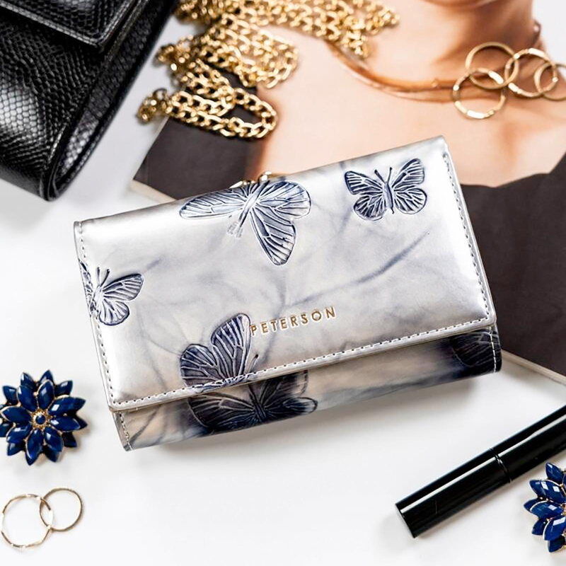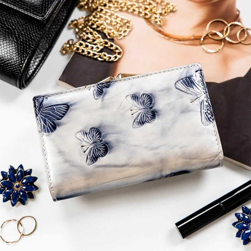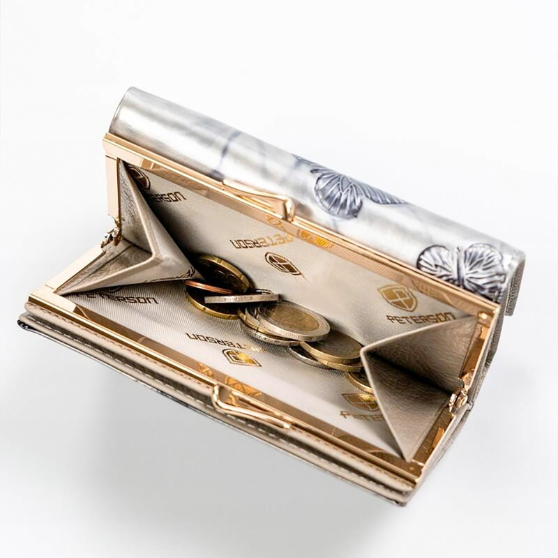 Menšia značková dámska peňaženka s motýľmi je rozdelená na 3 časti, jednu časť tvorí vrecko na kovové mince, druhú časť priestorov na papierové bankovky a 14 slotov na platobné karty av zadnej časti potom nájdeme 4 väčšie vrecká na účtenky, tech. preukaz od vozidla a ďalšie drobnosti.