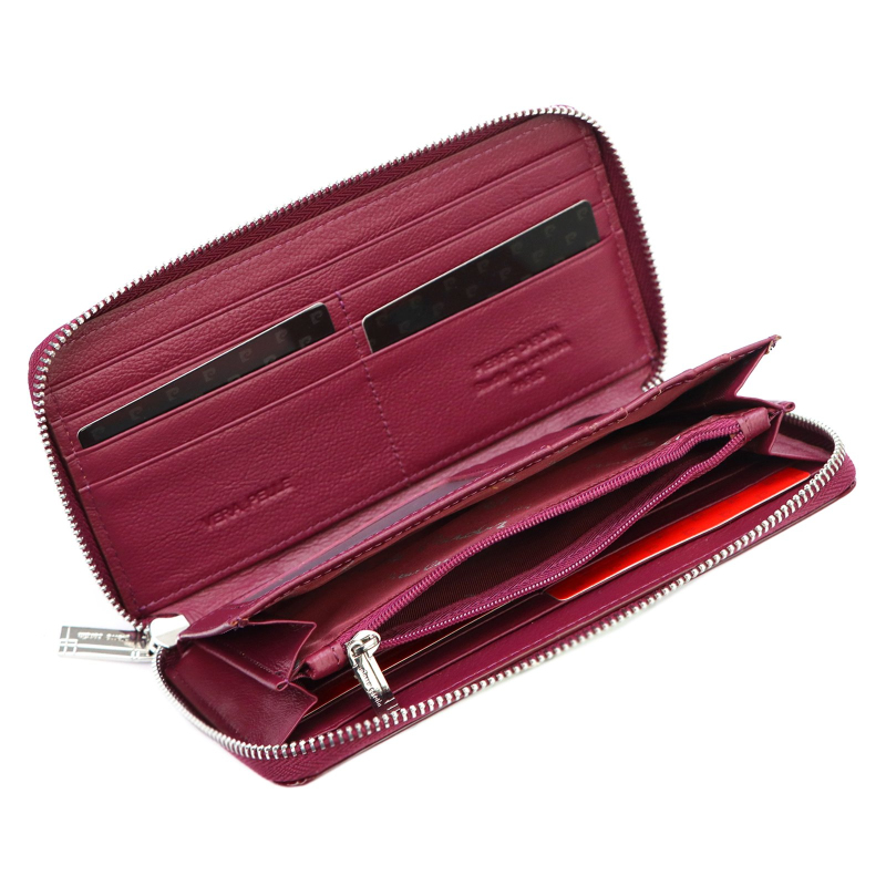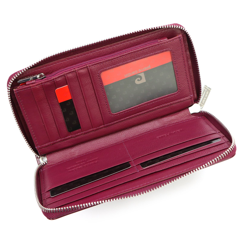 Vnútri dámskej peňaženky Pierre Cardin nájdeme 20 priehradiek na kreditnú kartu, dve priehradky na bankovky a priehradku na mobilný telefón, vrecko so zipsom na kovové mince a ešte ďalšie dve postranné vrecká vhodné napríklad na vodičský, alebo občiansky preukaz, účtenky, vreckovku atď.
