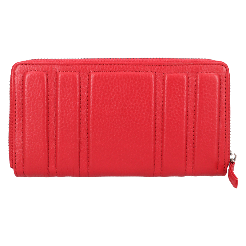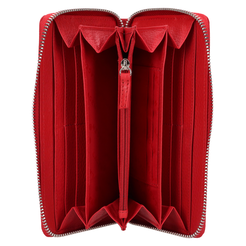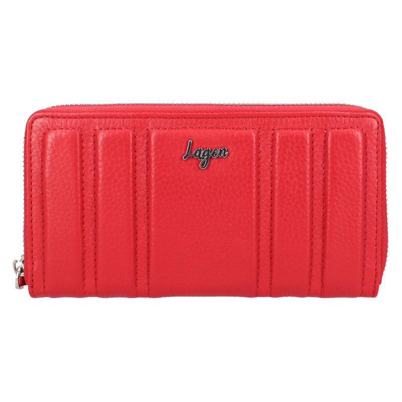 Značková červená dámska peňaženka s vreckom na mobil, bankovky a mince je vyrobená z kvalitnej prírodnej kože a zdobí jej strieborné kovové logo Lagen.