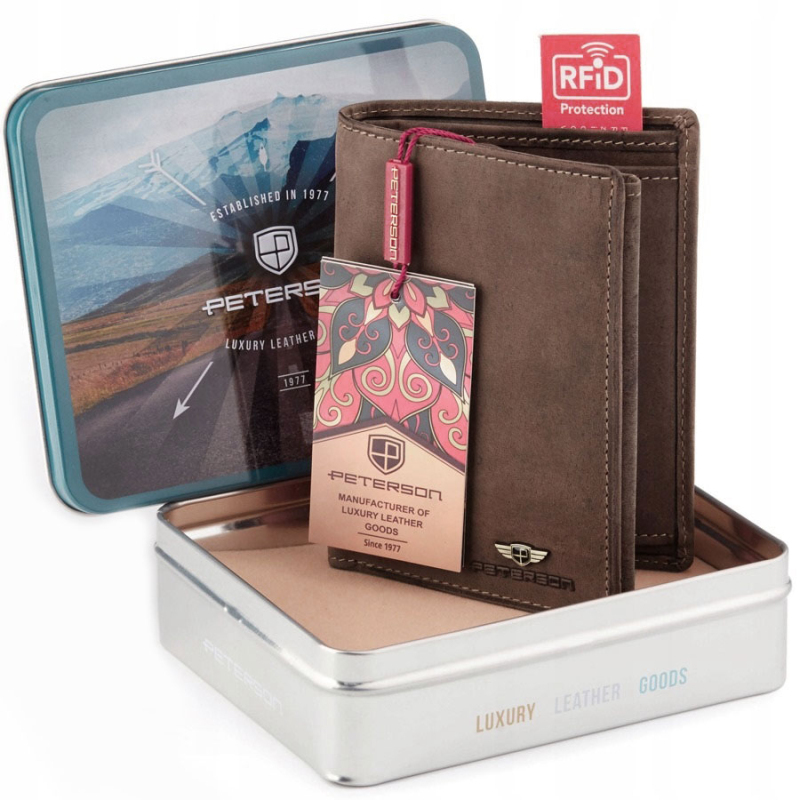 Značková hnedá pánska peňaženka Peterson je kombináciou hladkej tmavej a svetlej brúsenej prírodnej kože, čo vytvára elegantný a nevšedný vzhľad. Peňaženka je priestranná, má 2 priehradky na bankovky a jednu na kovové mince, 10 slotov na karty a 4 väčšie vrecká na technický preukaz, alebo iný doklad a vrecko so zipsom. Súčasťou balenia je vkusná darčeková krabička.