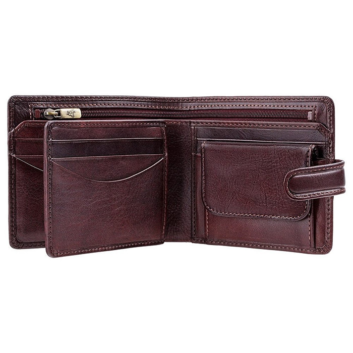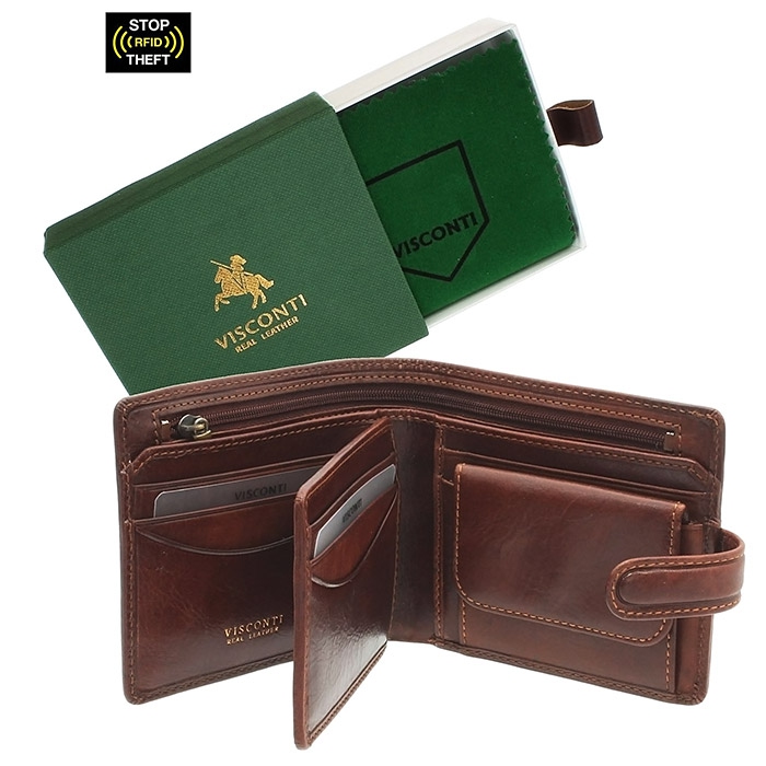 Hnedá značková pánska peňaženka Visconti je vyrobená z kvalitnej, prémiové prírodnej kože. Má 2 priehradky na bankovky, jednu na kovové mince a ďalej je vnútri pánske peňaženky 7 priehradiek vhodných na karty. Pánska peňaženka je dodávaná v darčekovej karabičke.