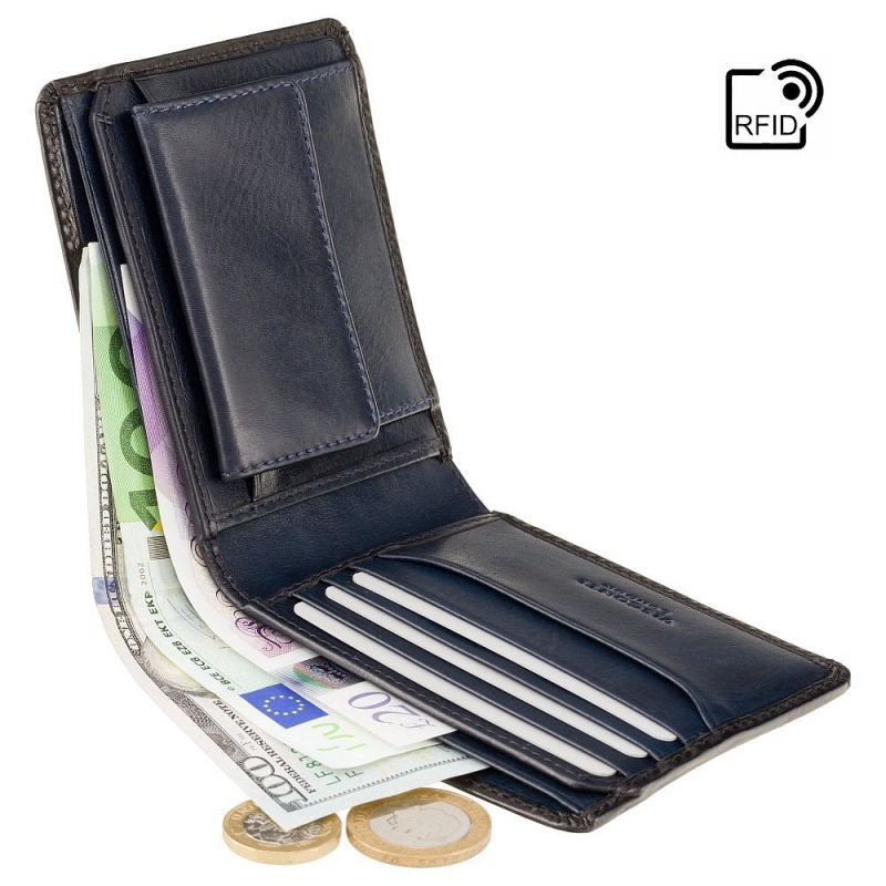 Peňaženka má 2 priehradky na papierové bankovky vhodné pre eurové aj zahraničné meny, jedno vrecko na kovové mince, 6 slotov na karty a na zadnej strane priehradku na kartu s funkciou Tap & Go (Prilož a choď). Súčasťou balenia je aj darčeková krabička na pánsku peňaženku.